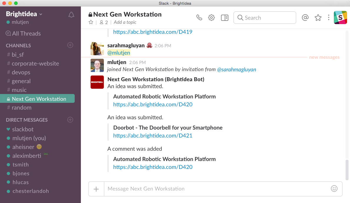 Slack Integration. A powerful tool that brings team communication and collaboration into a single place, Slack is being rapidly adopted by many organizations. And you can now use it to stay on top of your initiatives in Brightidea. Whenever an important event occurs in the platform (such as a new idea or comment being submitted), a notification is sent to a Slack channel of your choice—in real time. Best of all, you can easily add this functionality yourself in just a few short steps; our Setup Guide explains how.